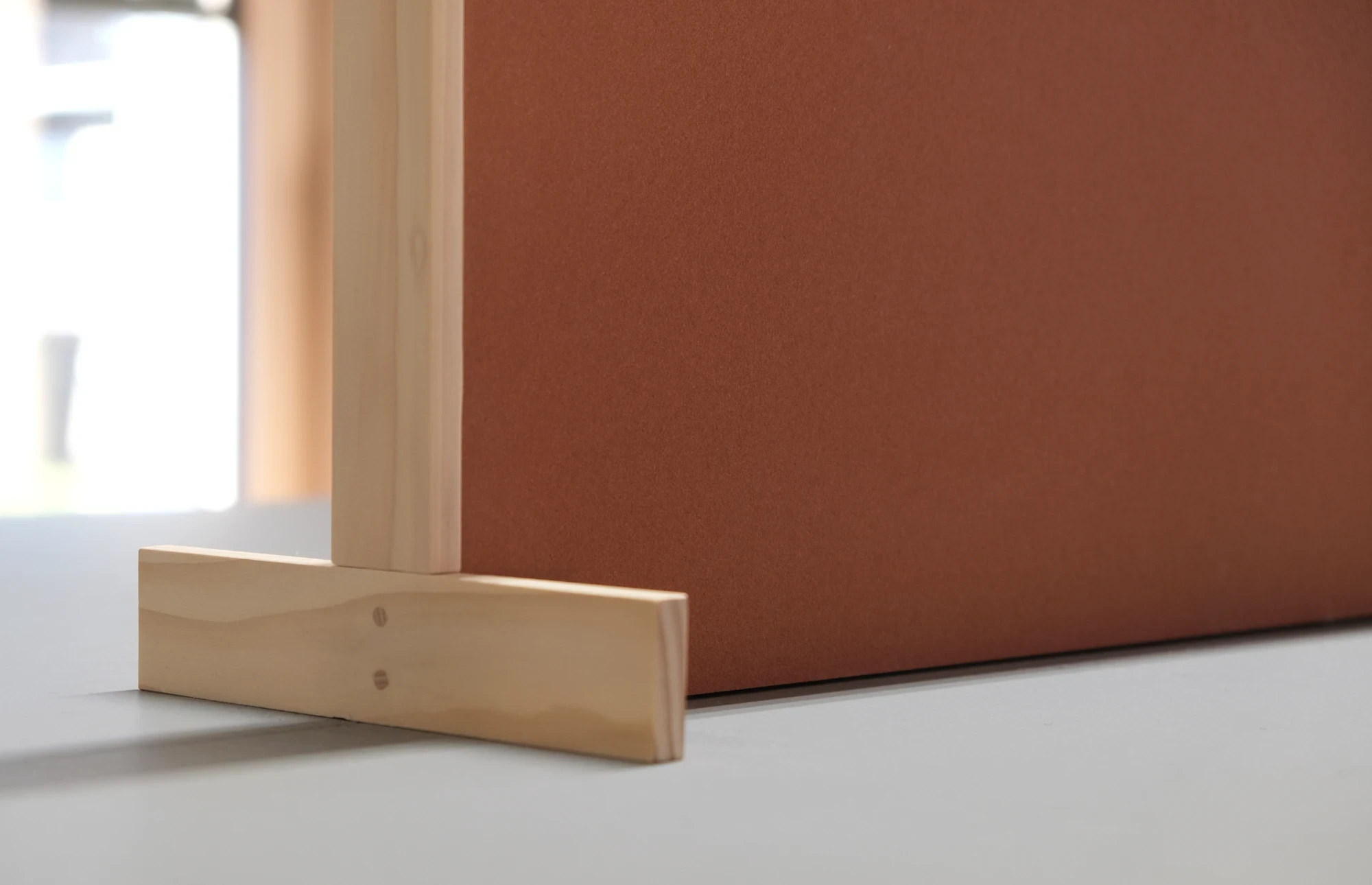 Die Materialwahl fiel entsprechend leicht: alles aus Tanne-Dreischichtplatte - unbehandelt. Ergänzt wurden die Holzflächen mit Materialien in den Unternehmensfarben: widerstandsfähiges Linoleum mit angenehmer Haptik auf den Deckplatten, Bulletin Board für Pinnwände und Merinofilz als akustisch wirksame Elemente.